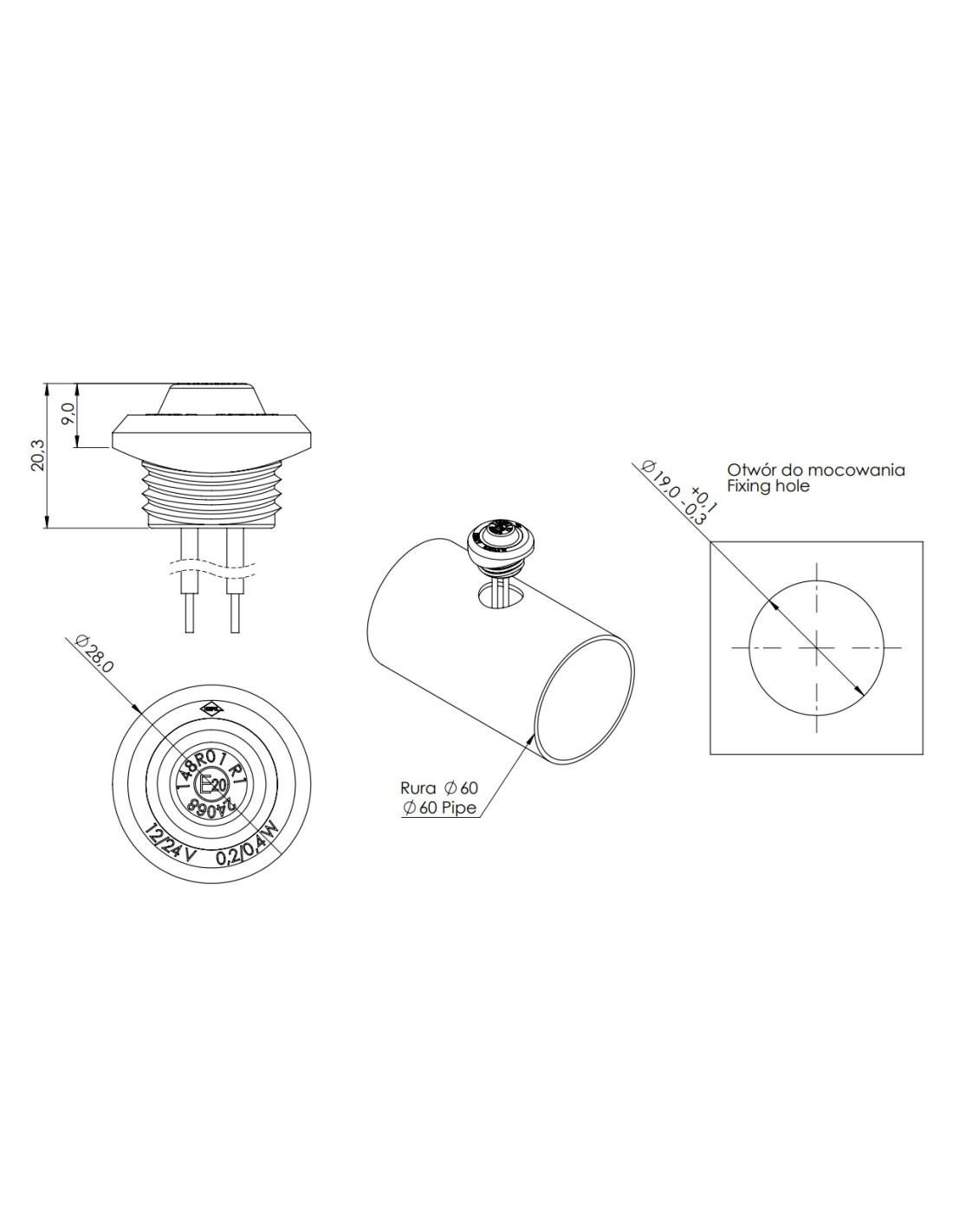 – Lampa została zaprojektowana do montażu na rurze o średnicy Φ60, poprzez umieszczenia jej w otworze o średnicy Φ19.